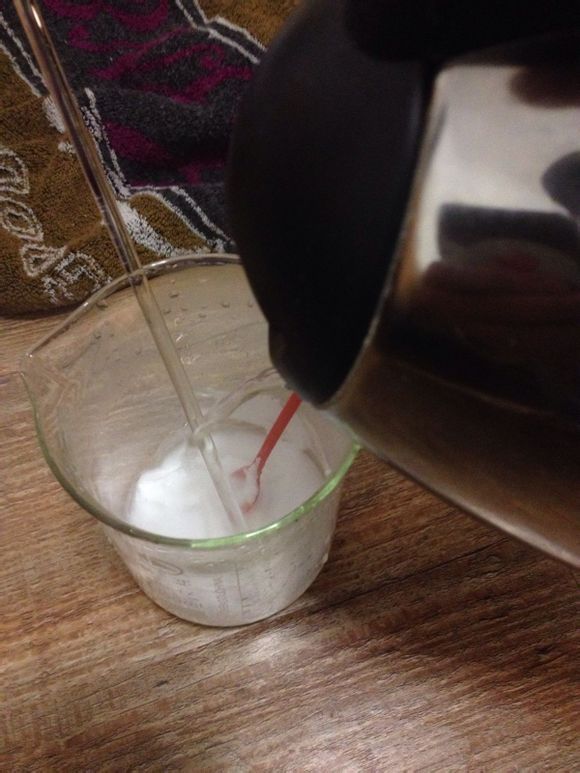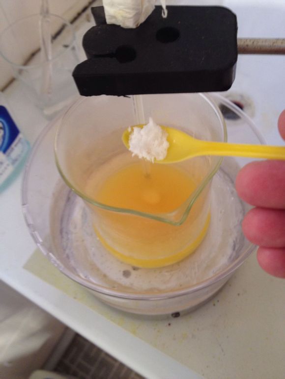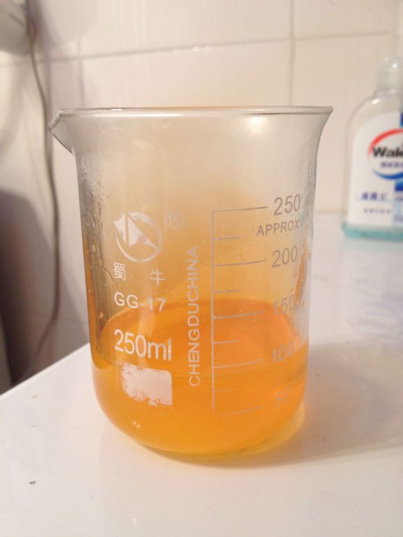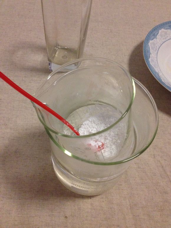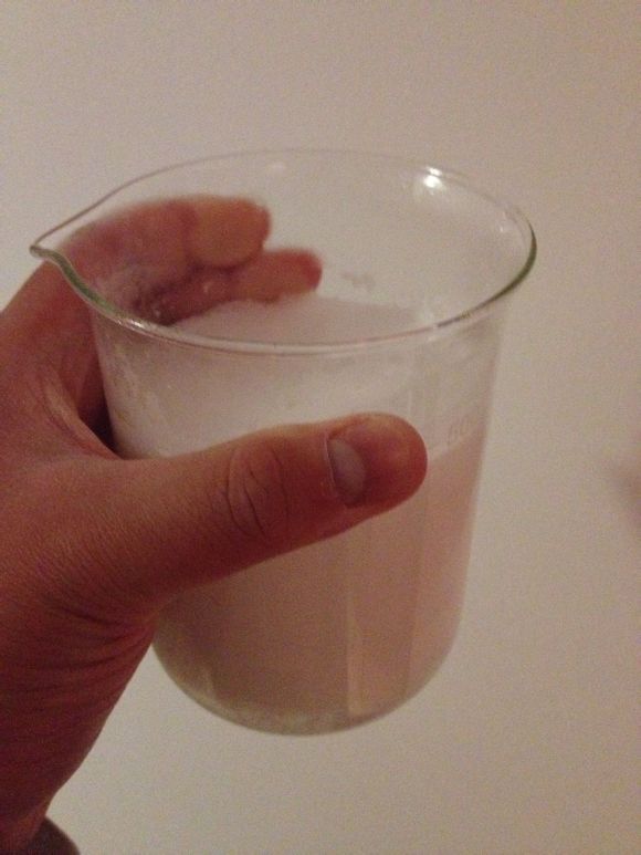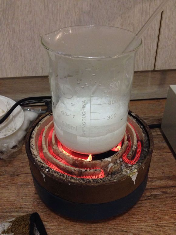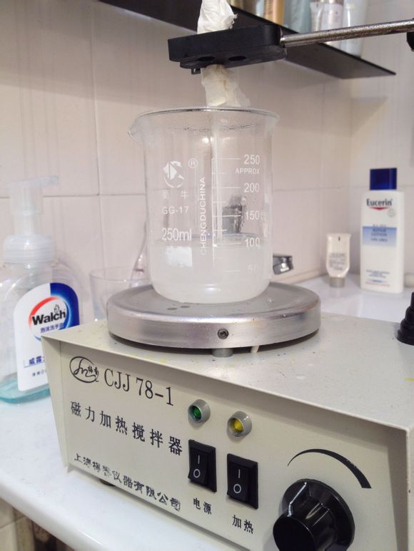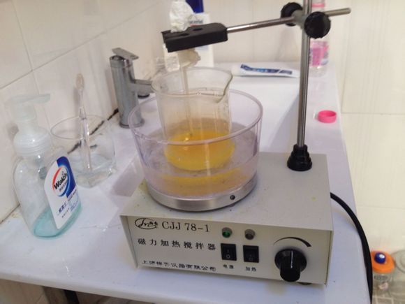 五、当乌洛托品加完时,溶液呈现白色浑浊。此时,撤去冰水浴,加热溶液至65℃-70℃。