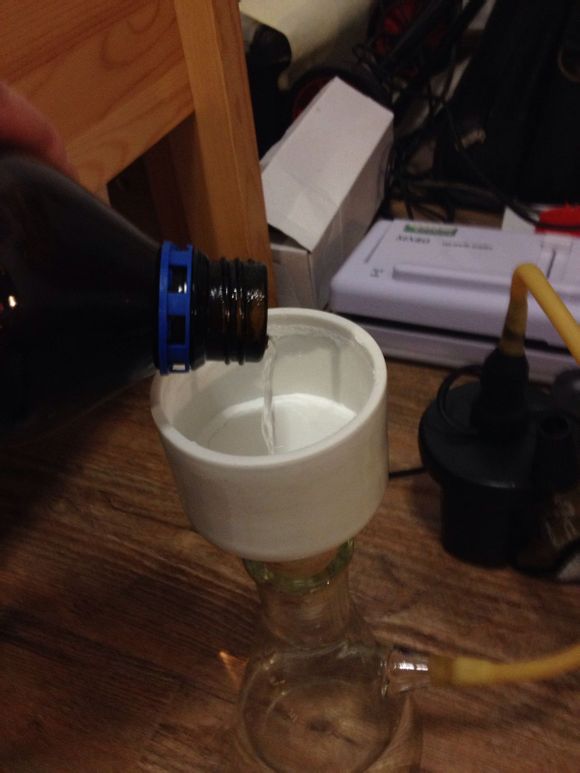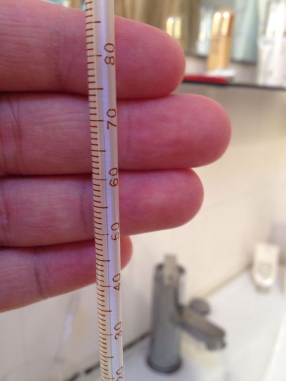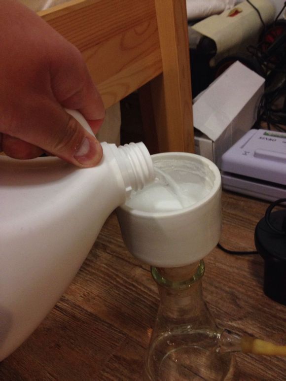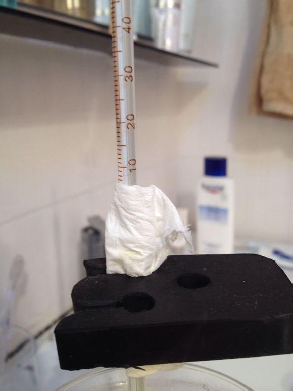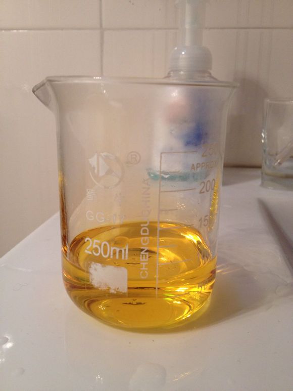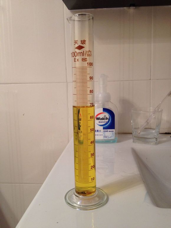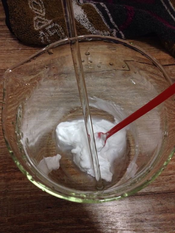 五、当乌洛托品加完时,溶液呈现白色浑浊。此时,撤去冰水浴,加热溶液至65℃-70℃。