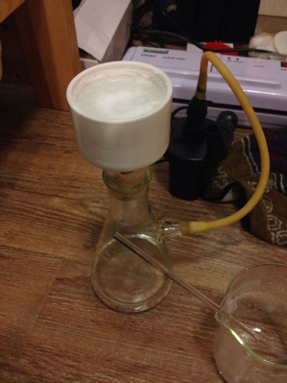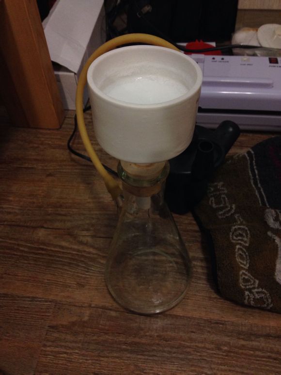 七、煮洗约10分钟后,冷却,抽滤,用95%工业酒精洗涤一次,再用无水酒精洗涤一次。