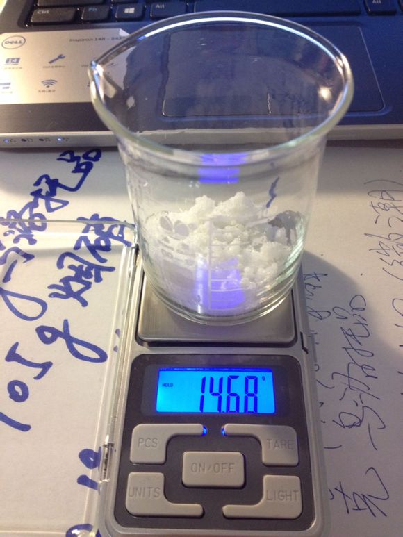 三、称取14.68克硝酸铵倒入烧杯中,并将烧杯置于冰水混合物中降温到20℃以下,放在磁力搅拌器上搅拌。