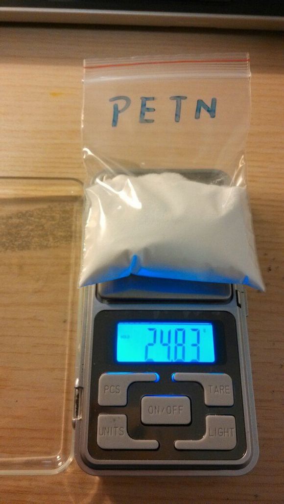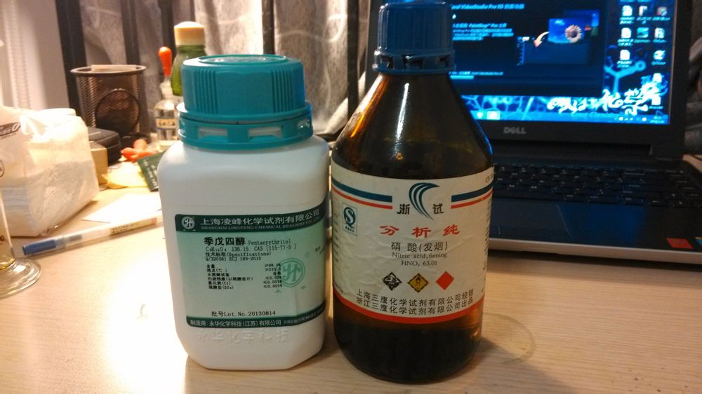 很长时间没有做PETN拿来扩爆了,这都归功于GTN的强大起爆能力,但是,上个月化学吧吧聚放炮时硝基胍拒爆让我意识到扩爆药的重要性,于是打算备点扩爆药。RDX可以作为扩爆药,且效果十分理想,但RDX(直接硝解法)成本太高,想来想去还是PETN最实惠,扩爆能力也一点儿也不逊色与RDX,仅仅是感度略高(小心使用还是安全的),安定性略差而已……