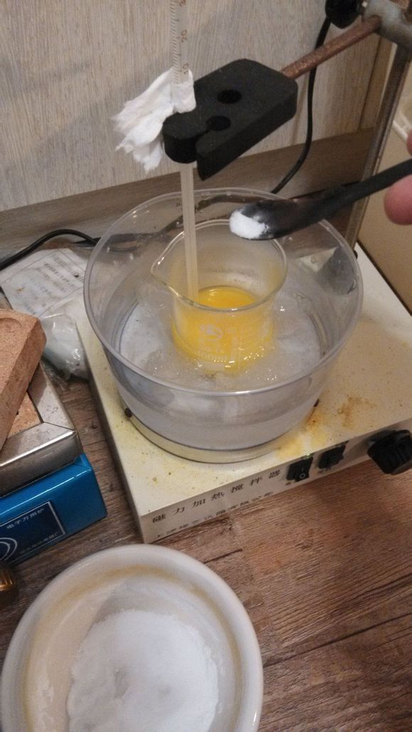 二、冰水浴控制温度在10~20度之间,强烈搅拌下向42毫升发烟硝酸中一勺一勺加入12克研磨过的季戊四醇,注意反应液温度千万不能超过25度,否则冒料。警戒值为28度,一般控制反应液温度不超过20度。