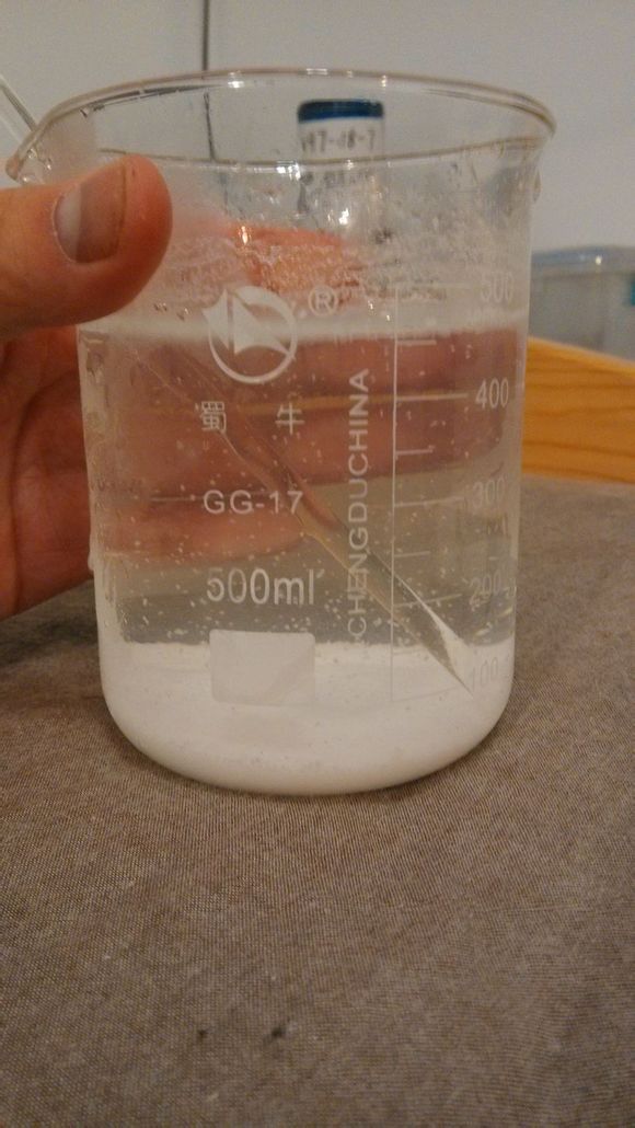 三、加完季戊四醇后,再继续搅拌5分钟,然后将反应液倒入大量冷水里,析出PETN。因为反应液粘稠,会粘在原来的烧杯壁上,所以还要用冷水冲洗原来的烧杯,再把洗下来的PETN倒入大烧杯的冷水里。如果不洗,一是浪费,二是残留在原来的烧杯壁上的反应液温度逐渐升高,最后冒料。