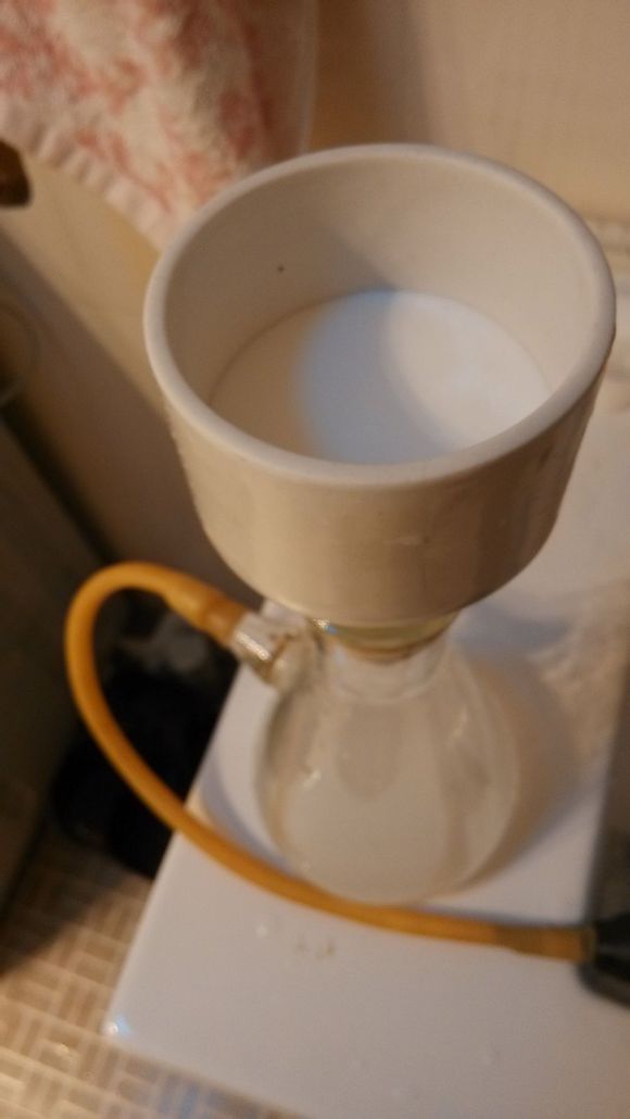 五、抽干后,把滤饼扣在培养皿里,捣碎,室温晾2小时,PETN干燥速度很快,酒精洗过的PETN 2个小时差不多就干了。(图是还没干的PETN)