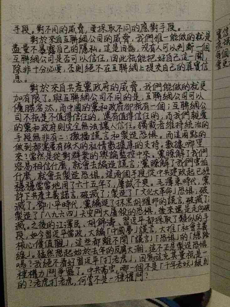 對於來自共產黨政府的威脅,我們能做的就更加有限了。與互聯網公司不同的是,互聯網公司可以優勝劣汰,而中國的黨和政府卻祇有一個;互聯網公司不祇是不值得信任的,還有值得信任的,而我們親愛的黨和政府卻完全無法讓人信任。獨裁者維持統治的手段無非有二:散播謊言和製造恐懼。而這兩點的做到都需要有強大的社情數據庫的支持。數據哪裏來?當然是從對群衆的輿論監控中來。黨瞭解了我們容易相信什麼,就會去編造謊言;黨瞭解了我們害怕什麼,就會去製造恐懼。這兩個手段從中共建政起已經穩穩當當地用了六十五年了,屢試不爽。毛澤東時代,黨許下共產主義諾言,破滅了;製造了「文化大革命」恐懼,破滅了。鄧小平時代,黨編造了抹黑胡耀邦的謊言,破滅了;製造了「八九六四」天安門大屠殺的恐懼,後來還是走向破滅。之後的江澤民、胡錦濤、習近平都採取了類似的手段,如今習近平當政,大編「中國夢」謊言,大推「社會主義核心價值觀」,這些都離不開「謊言」「恐懼」的「總路線」。猛然想起始於去年的反腐大潮,這不正是製造恐懼嗎?我絕不看好習近平「打老虎」,因爲這充其量祇是一種權力鬥爭罷了。中共高官,哪一個不是「千年老妖」級別的?老虎打老虎,何嘗不是一種權鬥?